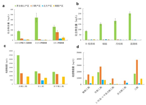 如上图所示,茅台镇产区的酒样中吡嗪类化合物含量远高于其它产区酒样,例如2,3,5-三甲基-6乙基吡嗪,2,3,5-三甲基吡嗪,2,6-二甲基吡嗪,这些化合物可贡献酒样焙烤、坚果的香气。