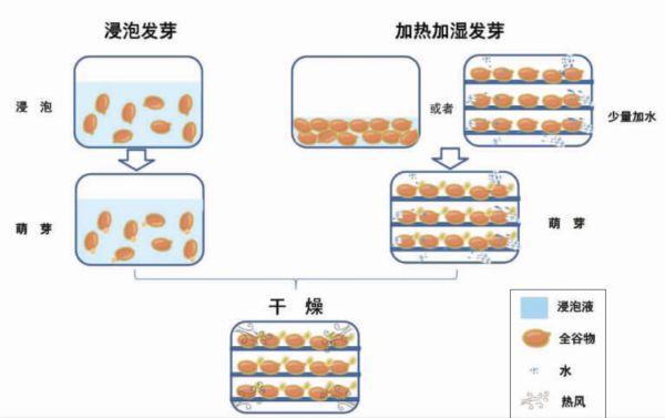 图2 浸泡发芽和加热加湿全谷物发芽方式对比示意图