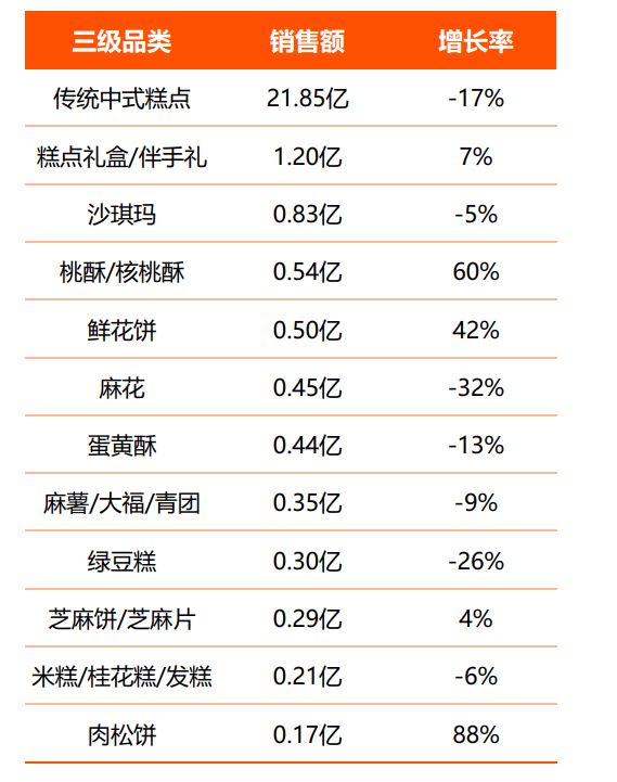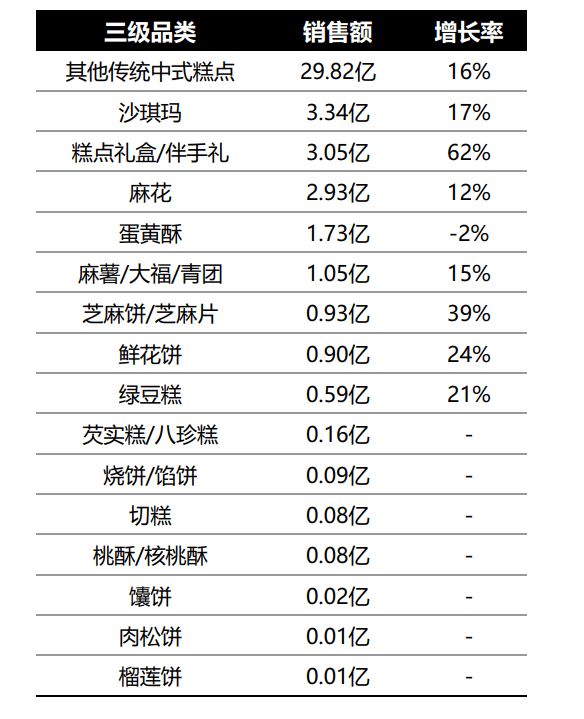 传统大类仍占据市场主导地位。而麻花、绿豆糕、蛋黄酥等品类增长率基本为负,部分传统品类需要通过创新焕发活力。