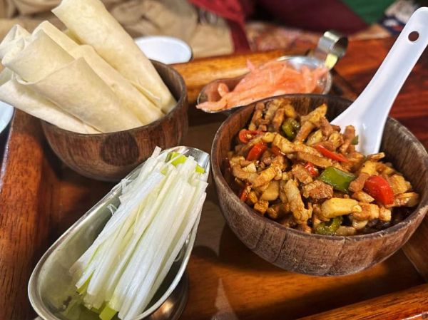 2种珍贵的食材成就了一道绝美的香猪薄饼配松茸酱,无需复杂的烹饪技术和多余的调料,只需把香猪肉切条,加入生抽、食盐炒熟,配上雪白的薄饼、清爽的葱丝,抹上松茸酱,放入嘴中,肥而不腻,香味浓郁。