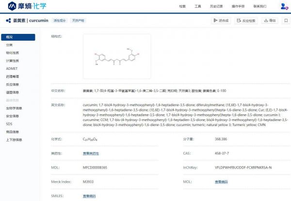 姜黄素的化学结构 图片来源:摩熵化学(MolAid)
