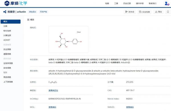 熊果苷的化学结构 图片来源:摩熵化学(MolAid)