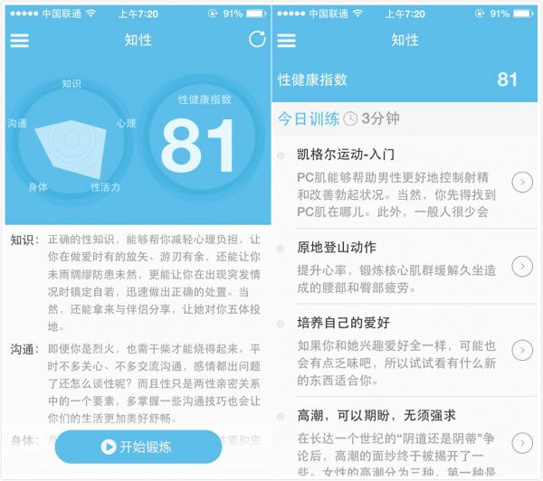 改善性健康状况方面,“知性”主要的方式是提供了每天三分钟的“训练课程”,通过普及类似于“凯格儿运动”之类的训练,让用户每天花上几分钟时间,锻炼自己,完成后赚取一定的分数,并最终改善自己的性健康指数。
