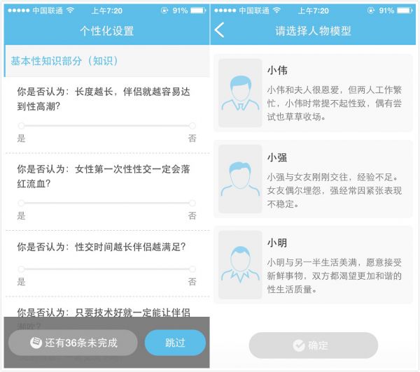 “知性”,是依托于果壳性情小组诞生的一款专注两性健康的 APP,目前仅有iPhone版,它能够通过一套科学的问卷调查来确定你的性健康指数,或者你也可以跳过问卷,选择一个适合自己的人物模型,之后,“知性”能根据每个人不同的状况制定出相应的性健康干预方案。