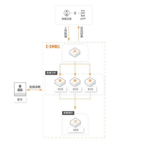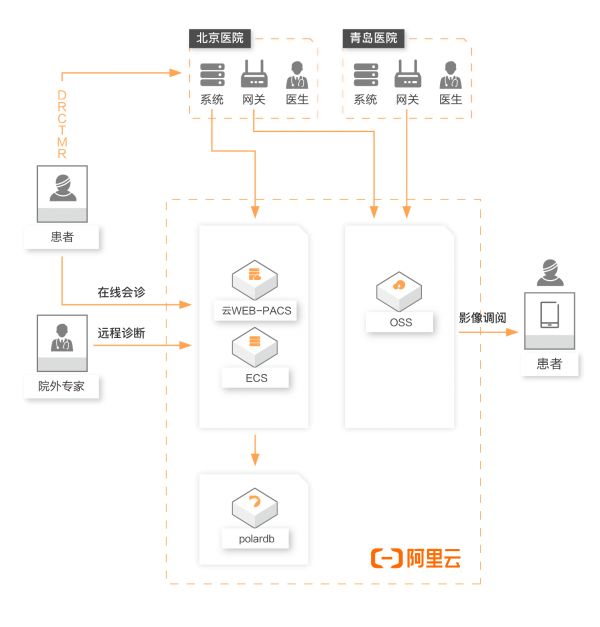 在云上通过 ECS 搭建 web-pacs 系统,本地网关及系统使用公网上云链路,传输患者影像数据到 OSS,实现弹性存储,患者可通过移动端随时调阅报告结果。