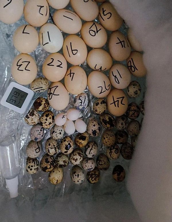 总共孵化35枚种蛋,成功孵化出28只鹌鹑(11只母鹌鹑,17只公鹌鹑)。现在鹌鹑已经12天大,完全不需要开保温灯(湖南天气较热),这是一次比较成功的孵化体验。