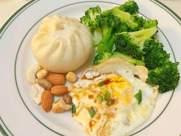 3.葱肉包+花菜+荷包蛋+无糖豆浆+坚果(全面的营养早餐,兼顾高纤维与高蛋白)
