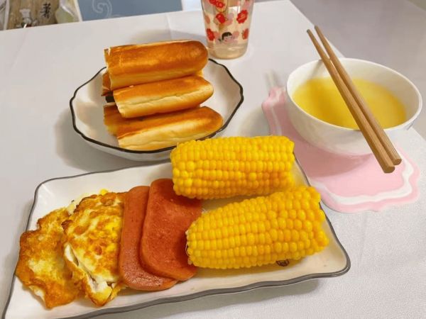 4.玉米火腿煎鸡蛋+小米粥+油条(简单又实用,快速为你提供充沛的能量)