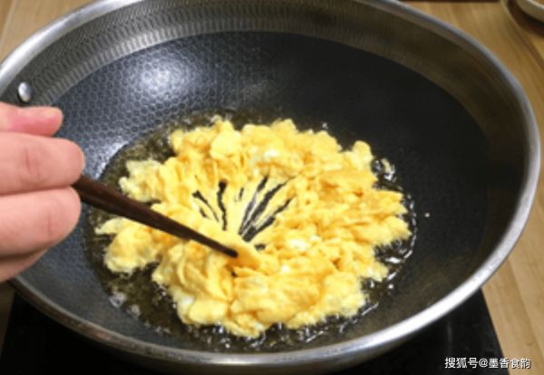 热锅凉油,油温六成热时倒入蛋液。待蛋液稍微凝固,用筷子快速划散,炒至八成熟即可盛出。不要炒得过老,因为后面还要与胡萝卜一起回锅。