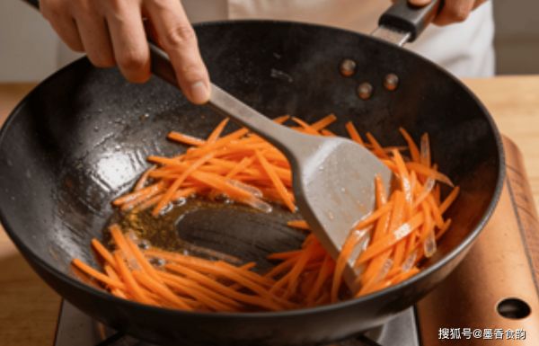 锅中再加少许油,放入胡萝卜丝,中火翻炒约2分钟。炒至胡萝卜丝稍微变软,边缘微微透明时,说明β-胡萝卜素正在释放,这是营养最易吸收的状态。