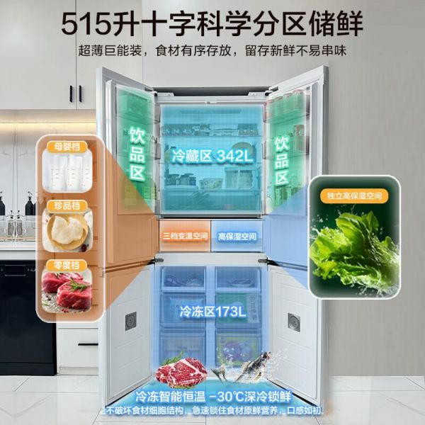 该冰箱采用了十字门设计,开门方式为90度直角开门,方便用户随时轻松取用食物。