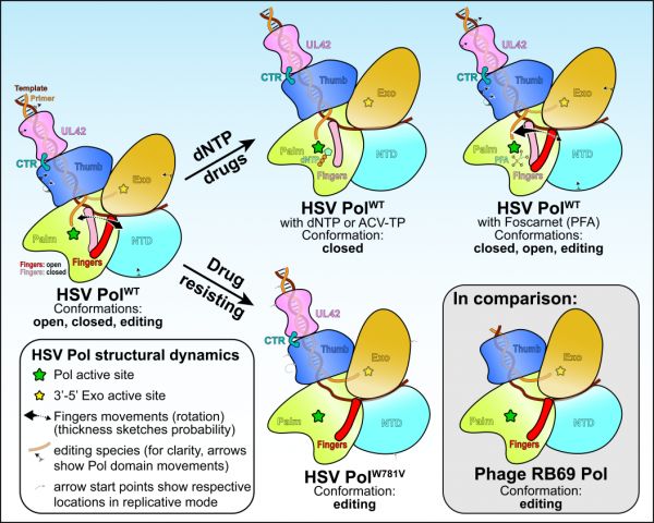该研究利用冷冻电镜(cryo-EM)技术发现了疱疹病毒聚合酶全酶复合物多种构象并存的现象(图1),并通过解析一系列高分辨率结构及详细的结构生物学研究与结构-功能分析阐明了DNA聚合酶的结构动态影响药物选择性及抗药性的分子机理以及该酶高效延续合成DNA的结构生物学原理。