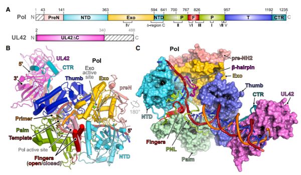 本研究报道了在引入或缺失核苷酸的情况下疱疹病毒Pol-UL42异源二聚体结合DNA引物-模板的高分辨率结构。这些结构的解析有助于阐明该病毒聚合酶持续进行DNA合成的机制,并可作为模板帮助设计捕获Pol不同构象状态的变构抑制剂,从而对抗抗病毒药物产生的新的耐药性。