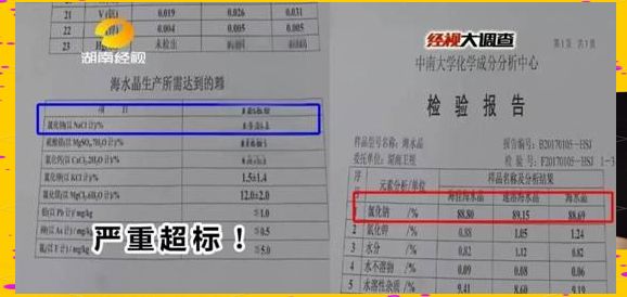 湖南经视曾对市面上的海水晶进行过一项调查,并委托中南大学化学成分分析中心进行检测。结果显示,市面上的海水晶存在“严重超标”的问题。