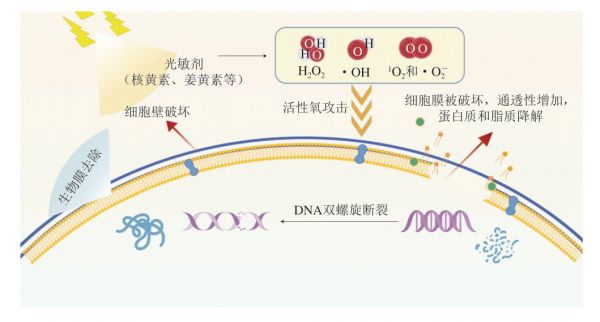 光动力灭活技术是指光敏剂在光/射线的照射下产生活性氧(H2O2、·O2-、·OH),导致微生物失活。光敏剂分为内源性和外源性,其中内源性光敏剂来自于微生物本身,外源性光敏剂则为人工合成或天然产物,如姜黄素、核黄素和TiO2等[21],其主要作用机制见图3。微生物经光动力灭活处理后,其细胞膜、细胞壁及生物膜均会遭到破坏,同时也会加速脂质氧化,改变水产品的色泽与品质[22]。其中,Li Huihui等[23]研究证实,通过核黄素介导光动力灭活能有效杀灭沙门氏菌,且不会对金枪鱼的总蛋白与TVB-N含量造成影响。
