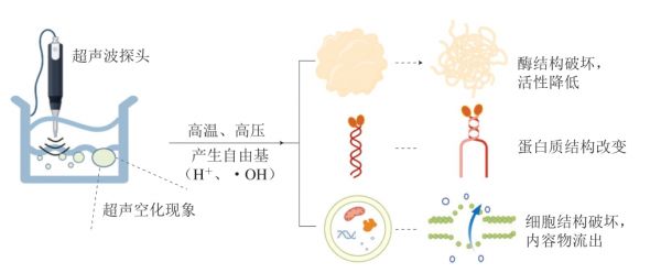 超声是指频率超过20 kHz的声波,其能产生独特的空化现象,可同时产生热效应和机械效应,达到灭菌、灭酶与蛋白质改性等目的,其主要工作原理如图1所示。超声处理在食品加工领域应用具有营养成分损失少、无污染、无残留等优点,近年来在食品加工领域被广泛关注,尤其是对于热敏感的食品[12]。其中,周大鹏等[13]对海鲈鱼进行超声预处理,结果表明,20 kHz、600 W处理10 min可抑制贮藏过程中微生物的生长、脂质和蛋白质变性,降低酶活力,使海鲈鱼的货架期由10 d延长至12 d。此外,冯佳雯等[14]研究发现,超声可使鲈鱼肌原纤维蛋白结构发生改变,改善其凝胶性能。