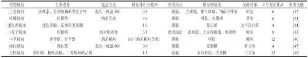 植物精油是从植物的根、叶或果实中提取出的具有挥发性的油类物质,具有抑菌、抗氧化等生物活性。植物精油是一种天然的生物保鲜剂,具有无毒、环境友好、经济、抑菌效果好等优点[40]。迄今已有很多研究者将其作为活性物质加入聚合物基质中,以薄膜、乳液的形式应用于水产品保鲜。但因精油稳定性低、易挥发等缺陷,需对其进行包封,才能更好地用于食品保鲜中。常见的包封方式有乳化、微胶囊、纳米纤维和纳米颗粒等[41]。目前植物精油用于水产品保鲜领域的研究较多,具体应用形式与包封方式见表2。