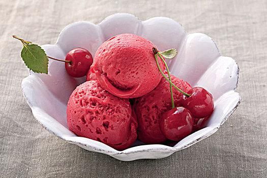 樱桃酱与蛋奶液混合后,在淡奶油中搅拌,最后倒入模具冷冻,做出甜美可口的樱桃雪糕。所需材料:淡奶油250毫升、牛奶200毫升、樱桃150克、鸡蛋2个、香草精1滴、白糖45克。