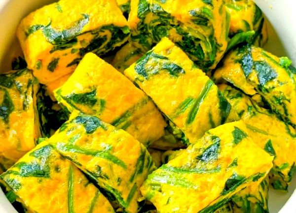 最后,将煎制好的菠菜鸡蛋卷切成适当大小的段状,即可享用这道美味佳肴。