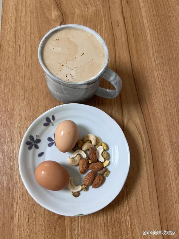 前一晚预约豆浆机,早上搭配鸡蛋和一小把坚果。