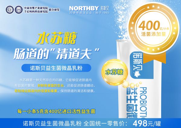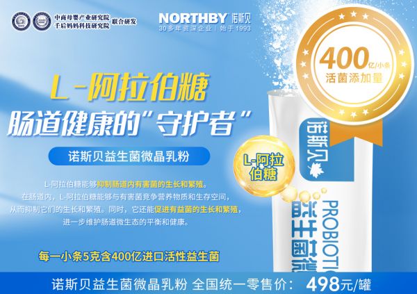 为了促进肠道益生菌的生长和繁殖,保持肠道微生态健康,诺斯贝益生菌微晶乳粉除了每条添加四百亿全基因序列菌株的活性益生菌之外,还特别添加了六大益生元:水苏糖、酵母β-葡聚糖、低聚半乳糖、银耳多糖、低聚果糖和L-阿拉伯糖。