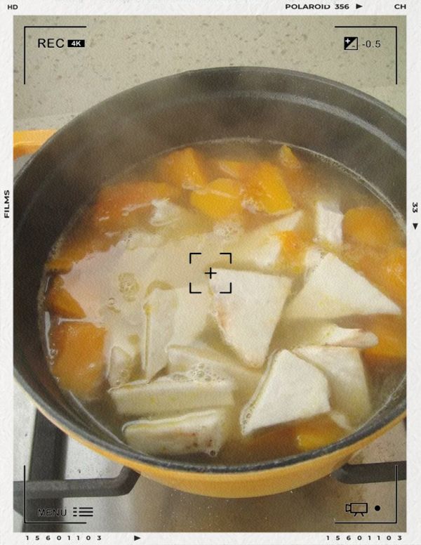 在汤锅中放入处理好的山药、牛蒡和胡萝卜,再加入当归、枸杞、红枣、姜片以及素高汤,煮沸。
