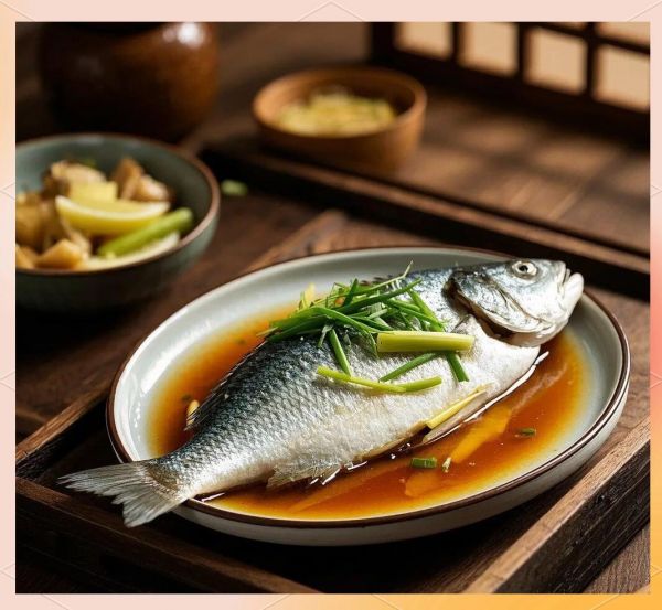 调味与装饰:蒸好的鲈鱼取出,去除葱姜,淋上蒸鱼豉油,再撒上少许葱花,最后浇上热油,激发出葱丝的香气。