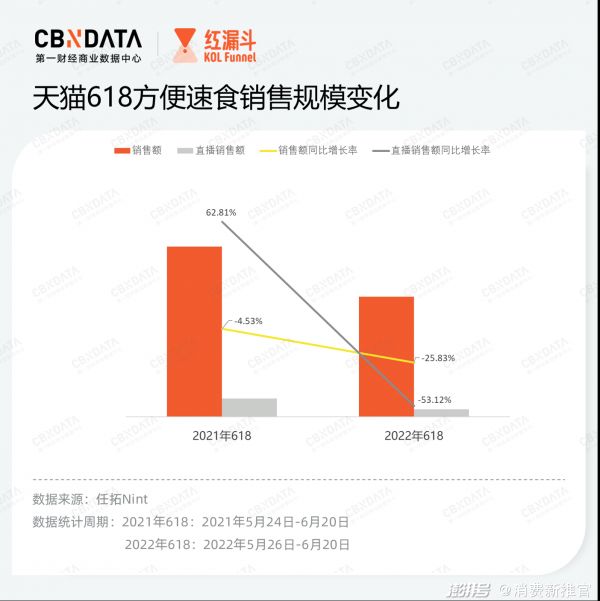 从数据结果来看,方便速食的下滑趋势在2021年618就出现苗头。这一年618,方便速食整体销售额相比2020年下降4.53%。不过,彼时直播销售额上涨超60%,还算挽回了一丝颜面。但在今年618,方便速食品类出现止不住的下滑,其中整体销售额下降25.83%,直播销售额下降超过50%。