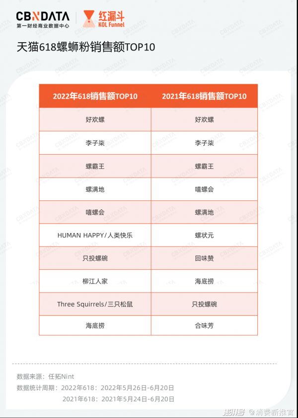 另一强势品类螺蛳粉赛道中,好欢螺、李子柒、螺霸王位居TOP3,这一座次在今年618与去年618相比没有任何变动,好学生始终保持稳定。螺蛳粉赛道近几年入局者众多,天眼查数据显示,截至2022年1月,我国现存螺蛳粉企业超过2.2万家,近9成注册时间在5年以内。这也让榜单4-10名的竞争非常激烈。