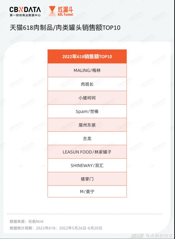 任拓Nint数据显示,2022年618肉制品/肉类罐头同比2021年618销售额增长近33%,直播引导销售额同比增长近100%,是今年618方便速食品类中增速最高的细分品类之一。该品类销售额TOP10榜单中,不乏梅林、世棒、古龙、双汇等传统品牌,而如肉班长、小猪呵呵、猪掌门等新品牌也在榜单中崭露头角。
