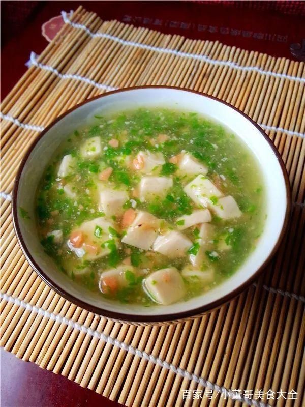 粉,植物油等调料。第一步首先将小青菜剁成碎末,记得尽量切小一些,新鲜的豆腐切成小块,大小类似打牌的筛子大小,将火腿也剁成一粒一粒的备用。锅里面倒入清水,大火烧热,水温五六成热即可将切成小块的豆腐倒入锅中焯一下水,大约两三分钟即可,时间不要太长,以防破坏豆腐的营养成分,如果温度太高煮太久豆腐也容易煮散,将焯好水的豆腐盛出,然后将锅中水倒掉,在锅中加入少许植物油,将切好的小青菜末倒入煸炒,待炒几分钟之后咱们就加入清水,煮大约10分钟作用,等锅中的汤冒泡,再加入食盐,最后将焯过水的豆腐倒入锅内,用锅铲慢慢的铲匀,大火略微煮下,加入适量的淀粉,再加入一杯清水,搅拌均匀,如果喜欢汤汁浓稠一些的话,可以将淀粉多加一些, 加入淀粉后用铲子小心的推动汤汁,以免豆腐煮散,五分钟后即可出锅,再撒上之前准备好的火腿丁,青菜火腿豆腐羹就大功告成了。