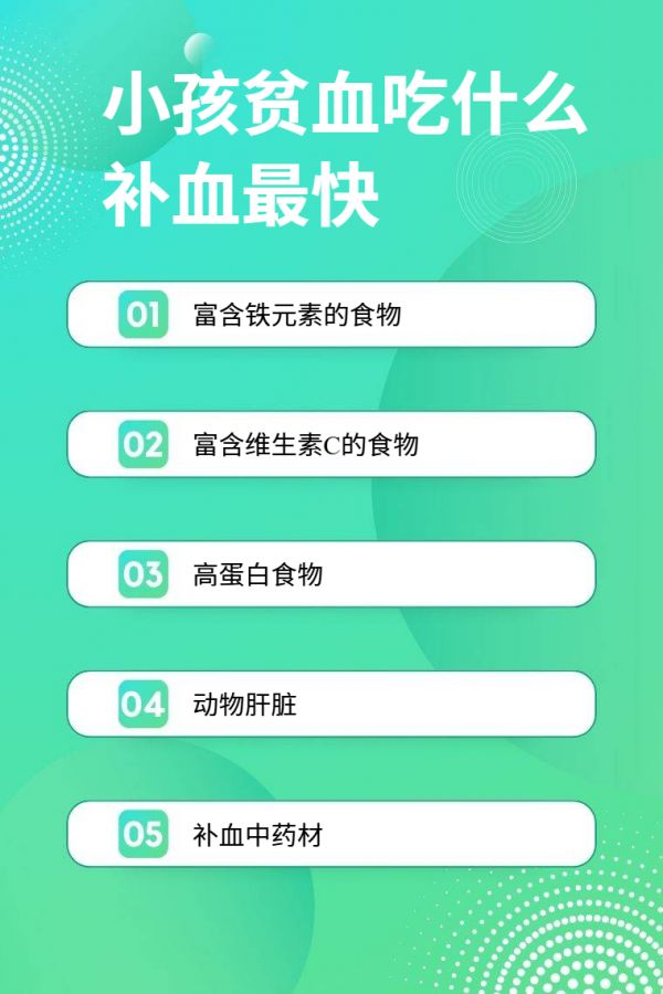 小孩贫血可通过食用富含铁元素的食物、富含维生素C的食物、高蛋白食物、动物肝脏、补血中药材等补血。