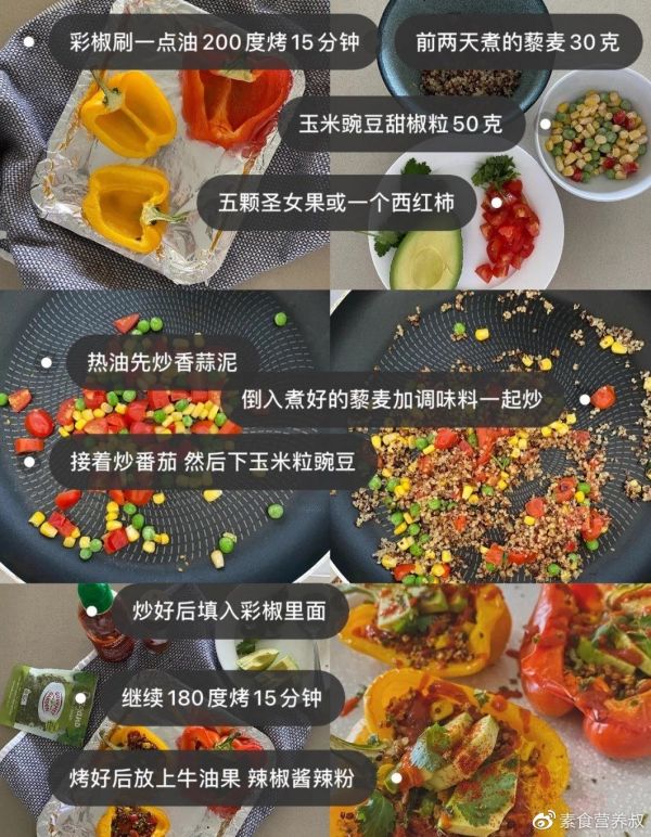 这道算是里面稍微麻烦点的了,但其实就是把食材炒一炒,装进彩椒里烤一烤就完事啦!藜麦咱们提前煮好一大锅,分好放冷冻能放一个月,要用的时候拿出来解冻就好。