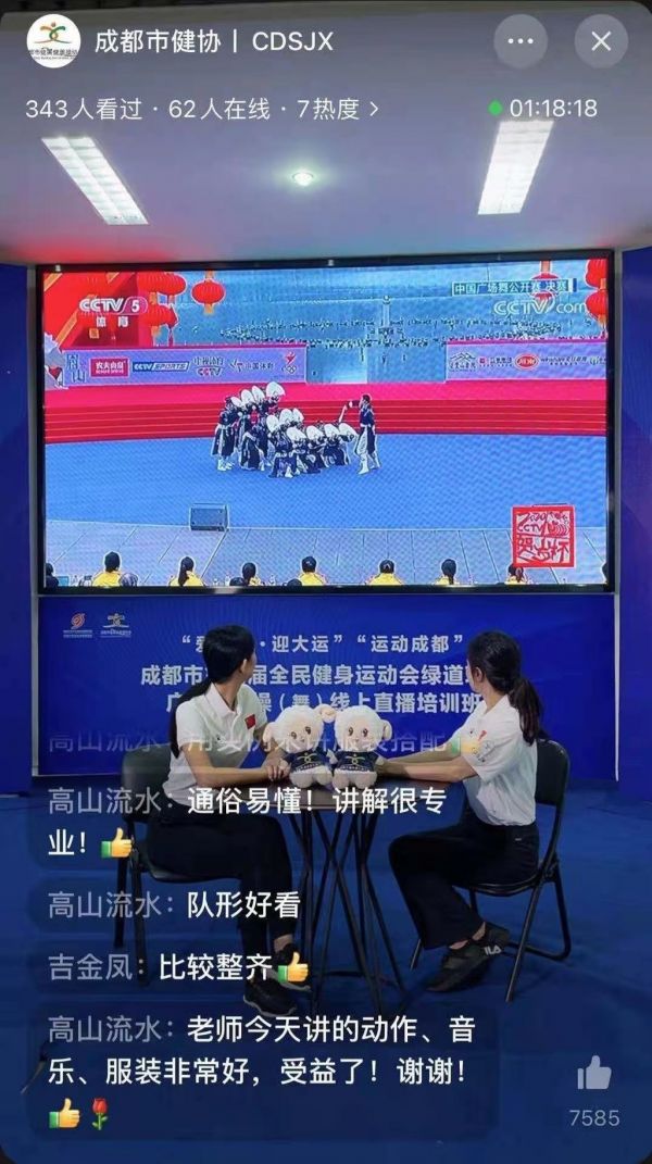 由成都市少年儿童业余体育学校、成都市健美健美操协会结合成都市第八届全民健身运动会工作要求,组织开展了“爱成都 迎大运”“运动成都”成都市第八届全民健身运动会绿道项目广场健身操(舞)系列线上直播培训班日前落下帷幕,本次直播活动得到23个区(市)县近500余个站点共计4500余名广场健身操(舞)健身骨干爱好者关注,场均直播互动信息上千条,直播获赞近10万次。