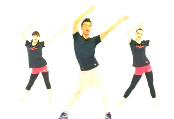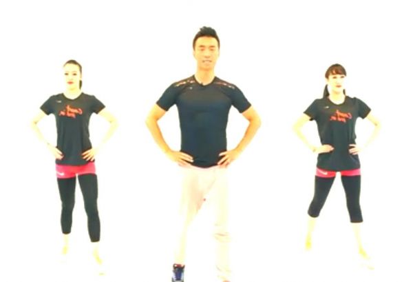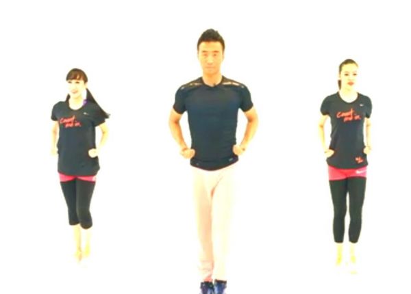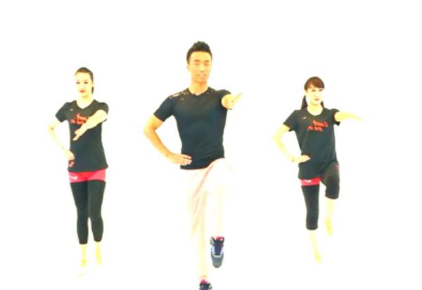 动作1要求左手轻扶腰间,同时手脚同步运动,循环三次后再反向重复。
