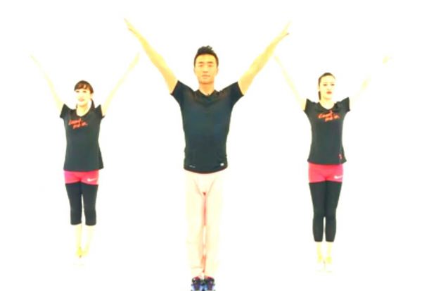 双手向上伸展,双脚同时向外蹦跳,随后双臂收回胸前并握拳,掌心相对,同时双脚也收回。