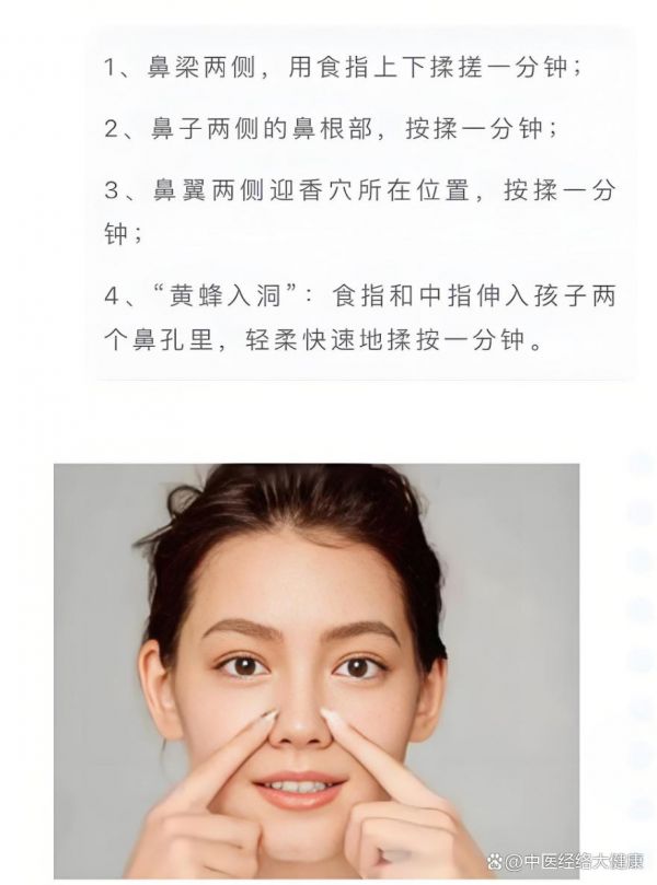 经络原理:迎香穴是大肠经与胃经交会穴,揉鼻可刺激鼻黏膜血液循环,增强呼吸道免疫力 。