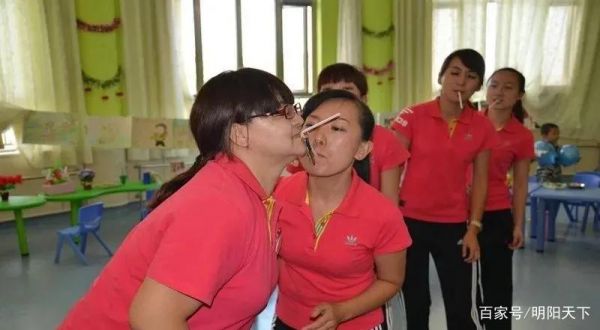 当然不是真的让大家亲吻。规则:每队开始发到一张A4纸,在只能用嘴的情况下,和下一位共同将纸撕掉,依次到最后一位,注意每次撕完之后只能用少的一半和在下一位继续撕,最后剩余最少的队伍获胜。