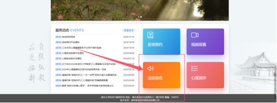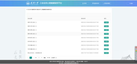 会员登录“武汉大学工会会员心理健康服务平台”(https://xlfw.whu.edu.cn/gh/),通过“活动报名”栏目选报团辅活动(操作指南见附件1)。