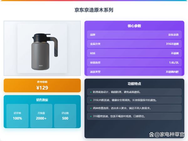 【316不锈钢材质】这款闷茶壶用的是316L不锈钢内胆和茶滤,长效保温保冷都挺靠谱,健康又安全。材质不易腐蚀,清洗也方便,平时倒水、泡茶都不用担心。