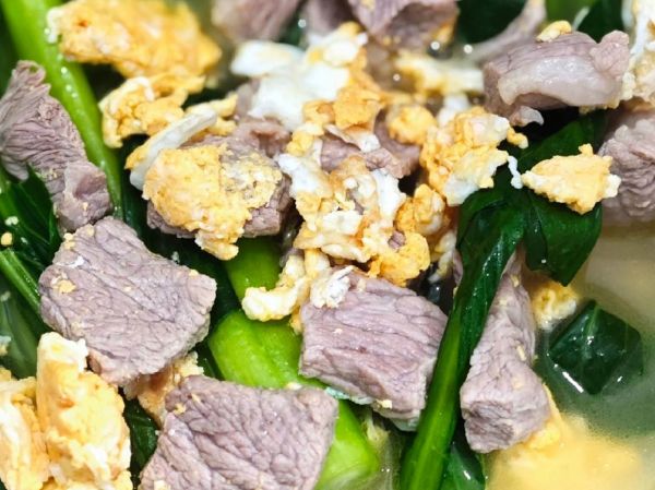3、然后把青菜心和牛肉放入一起煮熟,再加入适量的食盐和鸡精调味提鲜,即可出锅开吃。
