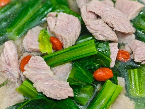 准备食材: 春菜、瘦肉、姜片、枸杞子。