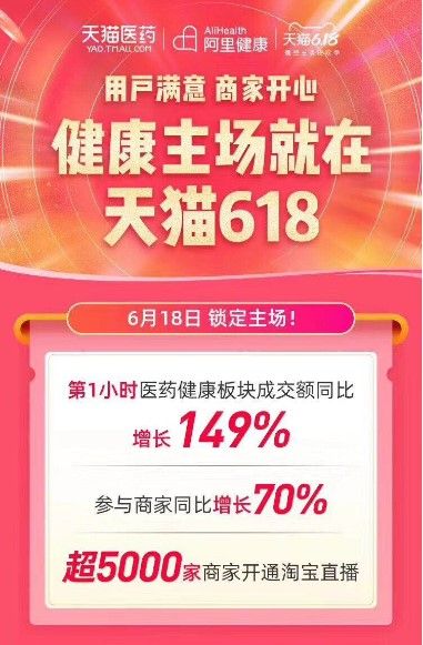 根据阿里健康数据显示,2020年6月18日凌晨第1小时,天猫医药健康板块成交额同比增长149%。今年天猫618,95后、00后活跃用户同比增长126%。