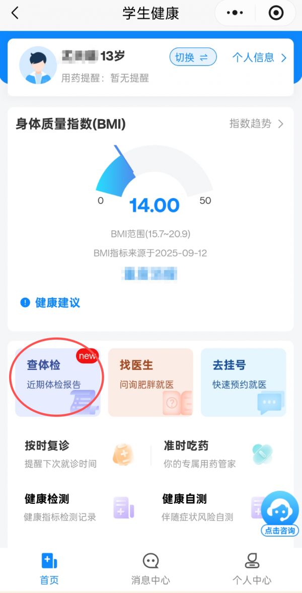 第一种情况:已关联孩子的电子健康卡,点击【学生健康】就可查看学生的体检信息。