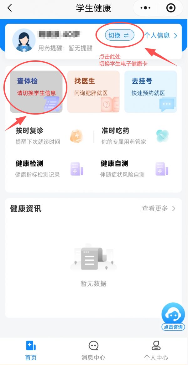 第二种情况:未关联孩子的电子健康卡,点击【学生健康】进入页面,切换学生的电子健康卡,即可查看学生的体检信息。