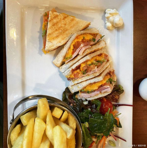 做法:面包烤至微脆,依次铺上生菜、煎蛋、火腿/培根、番茄和芝士,挤上酱料,对角切开摆盘,搭配一杯果汁更佳。