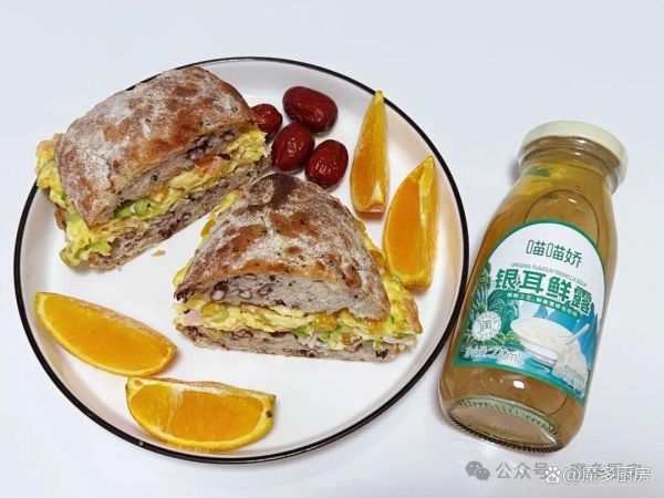 早餐一:银耳鲜露、恰巴塔炒蛋三明治、橙子。