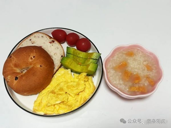 早餐二:红薯大米粥、蔓越莓贝果面包、炒鸡蛋、香瓜&小番茄。