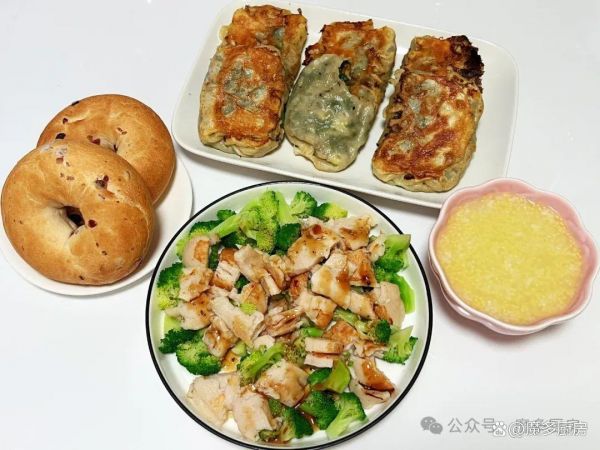 早餐七:二米粥、煎韭菜鸡蛋卷、蔓越莓贝果、西兰花鸡肉沙拉。