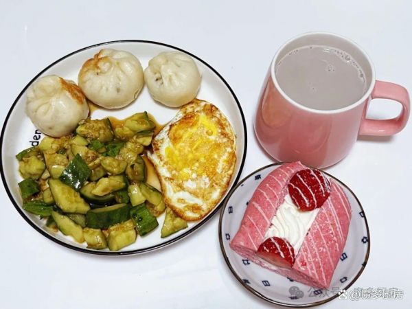早餐六:红豆薏米豆浆、草莓魔法棒面包、牛肉梅干菜包子、 煎鸡蛋、拍黄瓜。